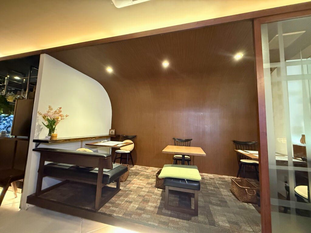 ビルの2階にある和モダンなお店で、奥へ進むとシックで大人っぽい空間も。
