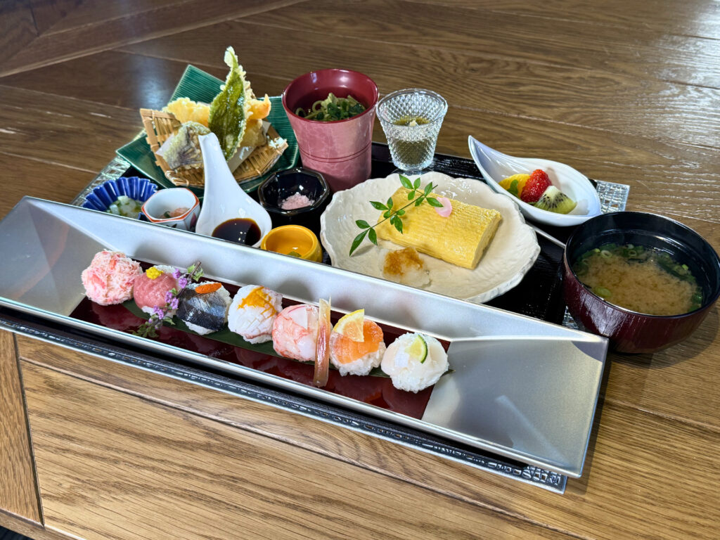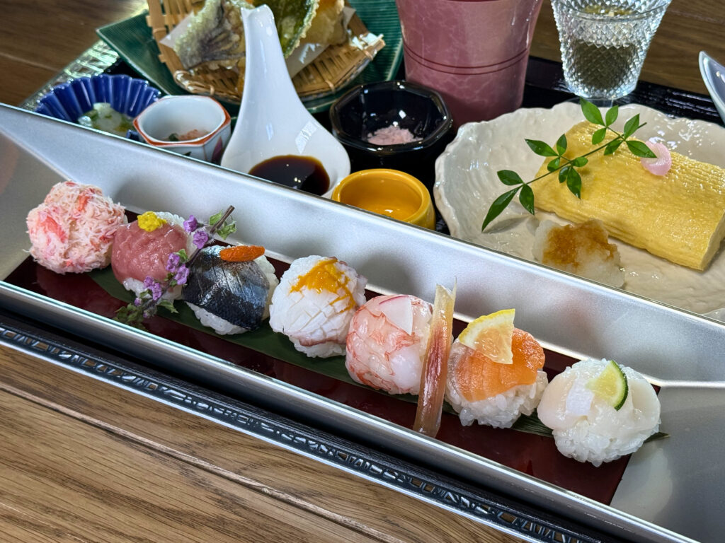 ※てまり寿し7種、クマンタだしまき、天ぷら、茶そば