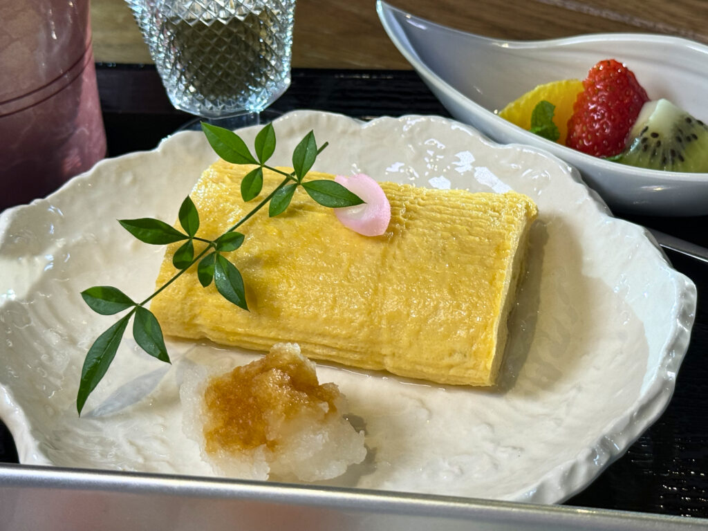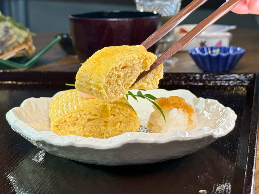 昆布とかつおだし、薄口しょうゆで味付けされた名物のだし巻き玉子。
