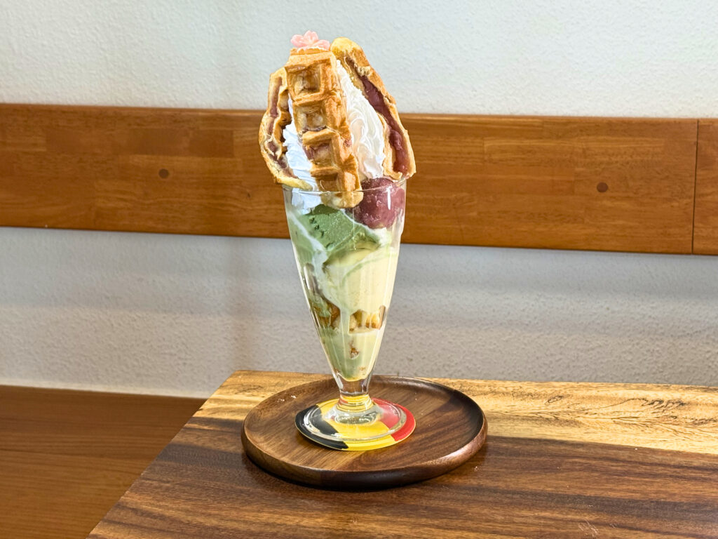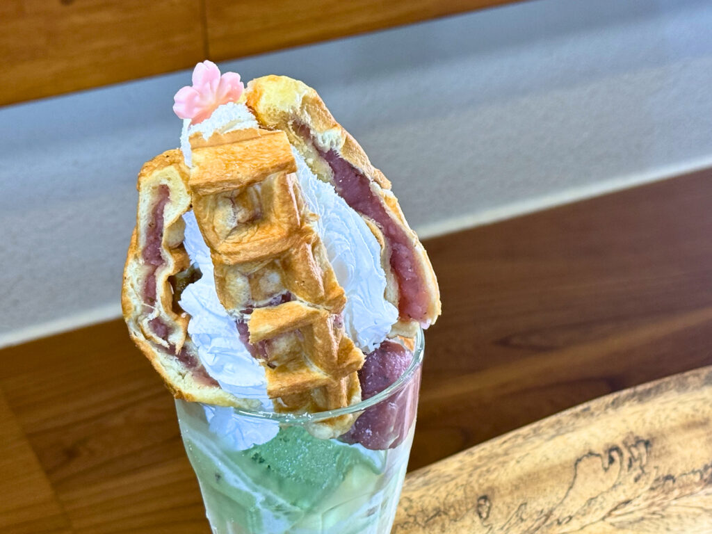 そして、ソフトクリームの上には焼き立ての「さくらあんのベルギーワッフル」がのっています🌸