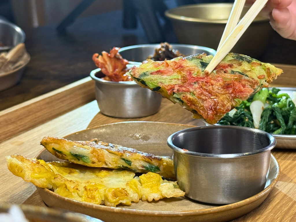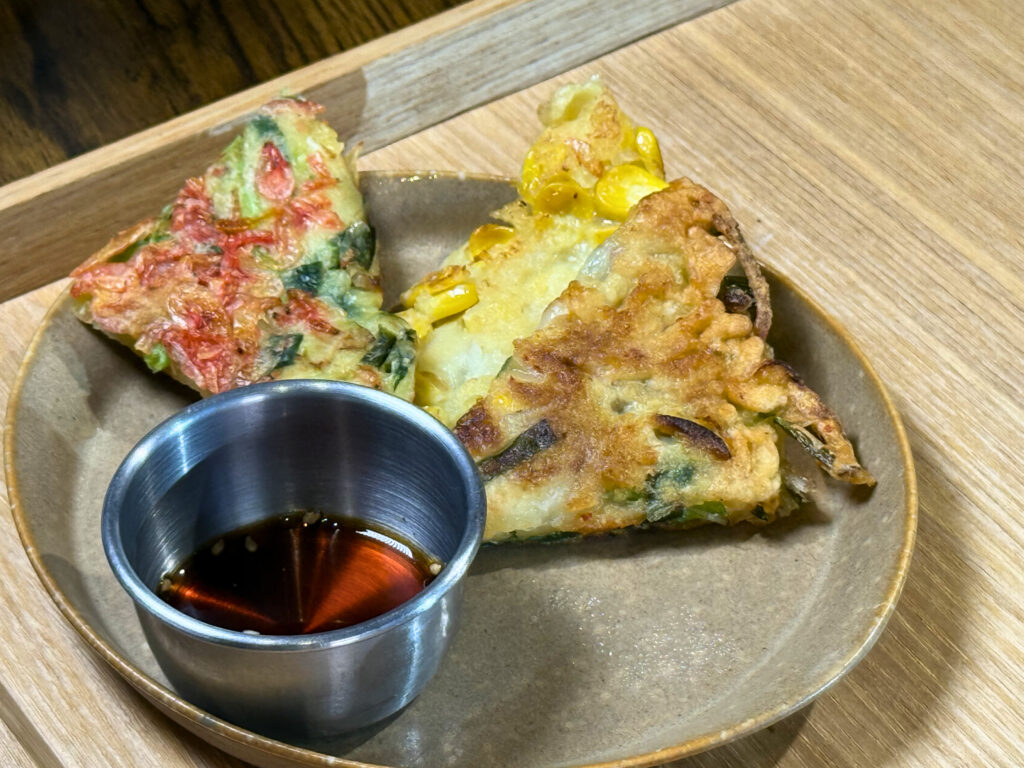 もちもちのチヂミは3種類ついてきます♪(画像左から「桜エビ」「トウモロコシ」「ニラとキムチ」)