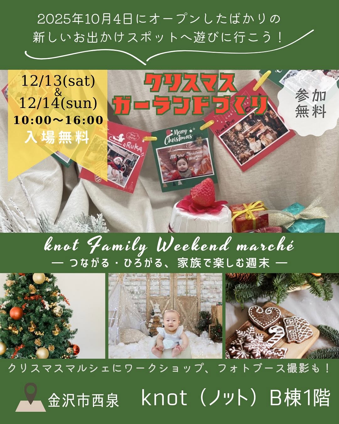 | 内容・特記事項 | 入場・参加費:無料(1家族につき一つ) ※事前予約優先制。 ※ワークショップご予約はこちら ※Knot公式LINEのご登録が必須になります(QRコードはこちら) イベント内容 ●クリスマスガーランドづくりワークショップ ●クリスマス・ファミリーマルシェ ●フォトブース設置 |