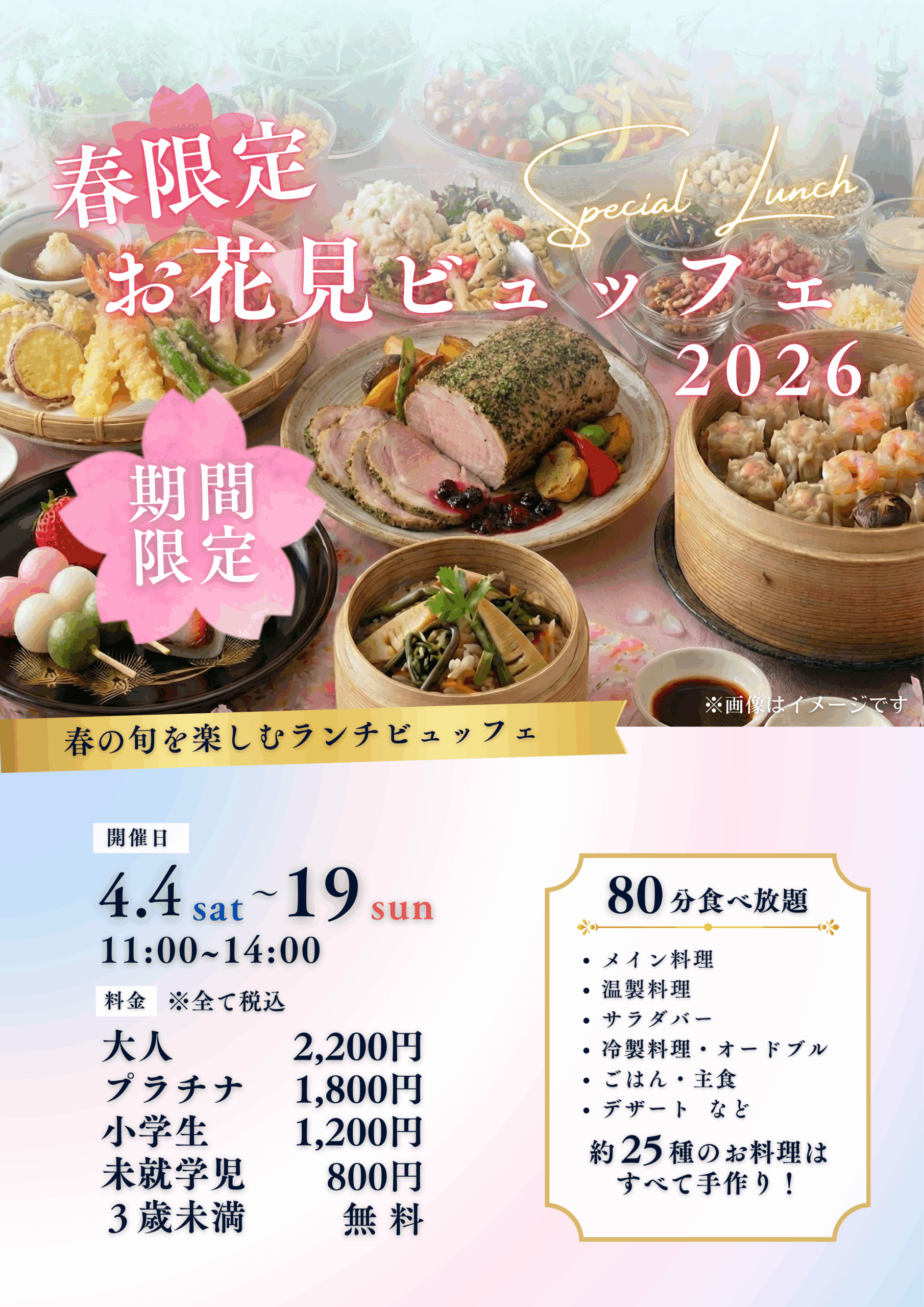 窓いっぱいに広がる桜を眺めながら、旬の味覚に舌鼓を打つ特別なランチタイム。山菜や春野菜など、素材を活かした約25種類の手作り料理を80分食べ放題でお楽しみいただけます。
