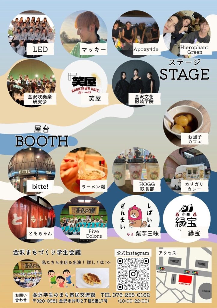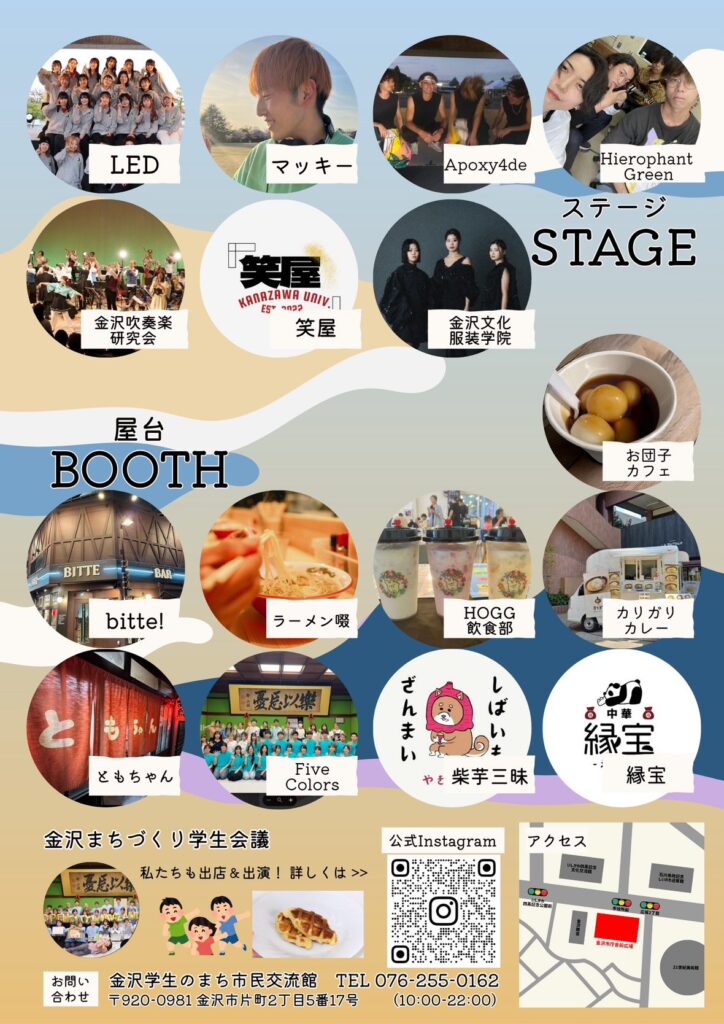 学生たちによるステージ発表や体験ブース、美味しいフード販売など盛りだくさん内容となっています!かつて學都として栄えた金沢のまちなかを、学生の力で盛り上げようという思いが込められているそうです♪お子さまから大人まで楽しめるそうなので、ぜひご家族と一緒に足を運ばれてみてはいかがでしょうか!