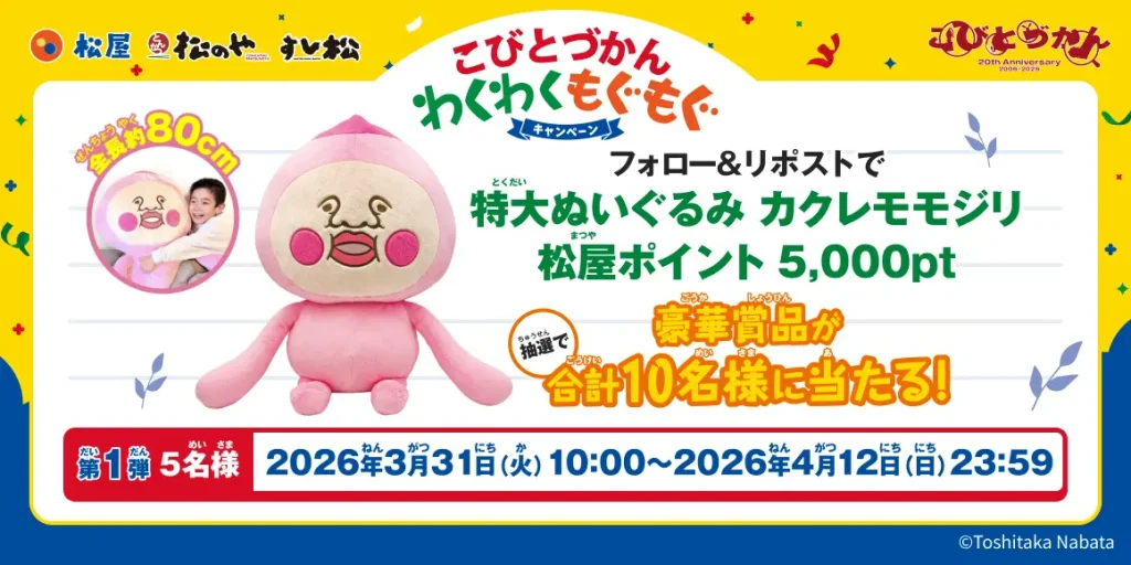 | 内容・特記事項 | キャンペーン期間中に松屋公式Xアカウント(@matsuya_foods)をフォロー、 対象の投稿をリポストすると「こびとづかん」グッズが当たる抽選に参加できます。 【当選景品】 ・「特大ぬいぐるみ カクレモモジリ」 ・「松屋ポイント5,000pt」 |