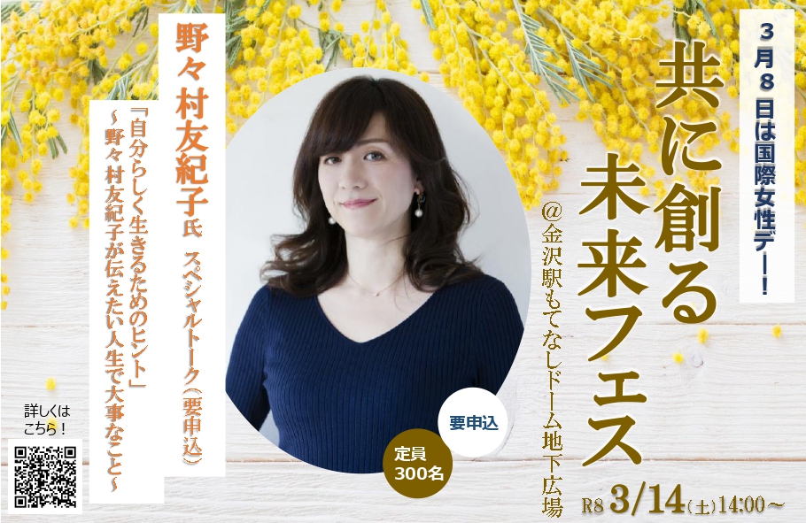 | 内容・特記事項 | ◆ステージプログラム|14:00〜18:00 ・共に創る未来フェス(主催:石川県) 【放送作家 野々村友紀子 スペシャルトーク】14:00〜15:20 自分らしく生きるためのヒント ~野々村友紀子が伝えたい人生で大事なこと~ <事前予約制>定員300名 ・パネルディスカッション 【第1部】15:40~16:10 すべての人が活躍するために必要なこと 【第2部】16:15~16:45 Power to Me #わたしらしく ・ゲストパフォーマンス 17:00~17:30 ◆会場プログラム|10:00〜18:00 ・ミモザマルシェ(出店者詳細はInstagramをご確認ください) ・企業ブース ・【石川県主催】能登農林漁業パネル展 |