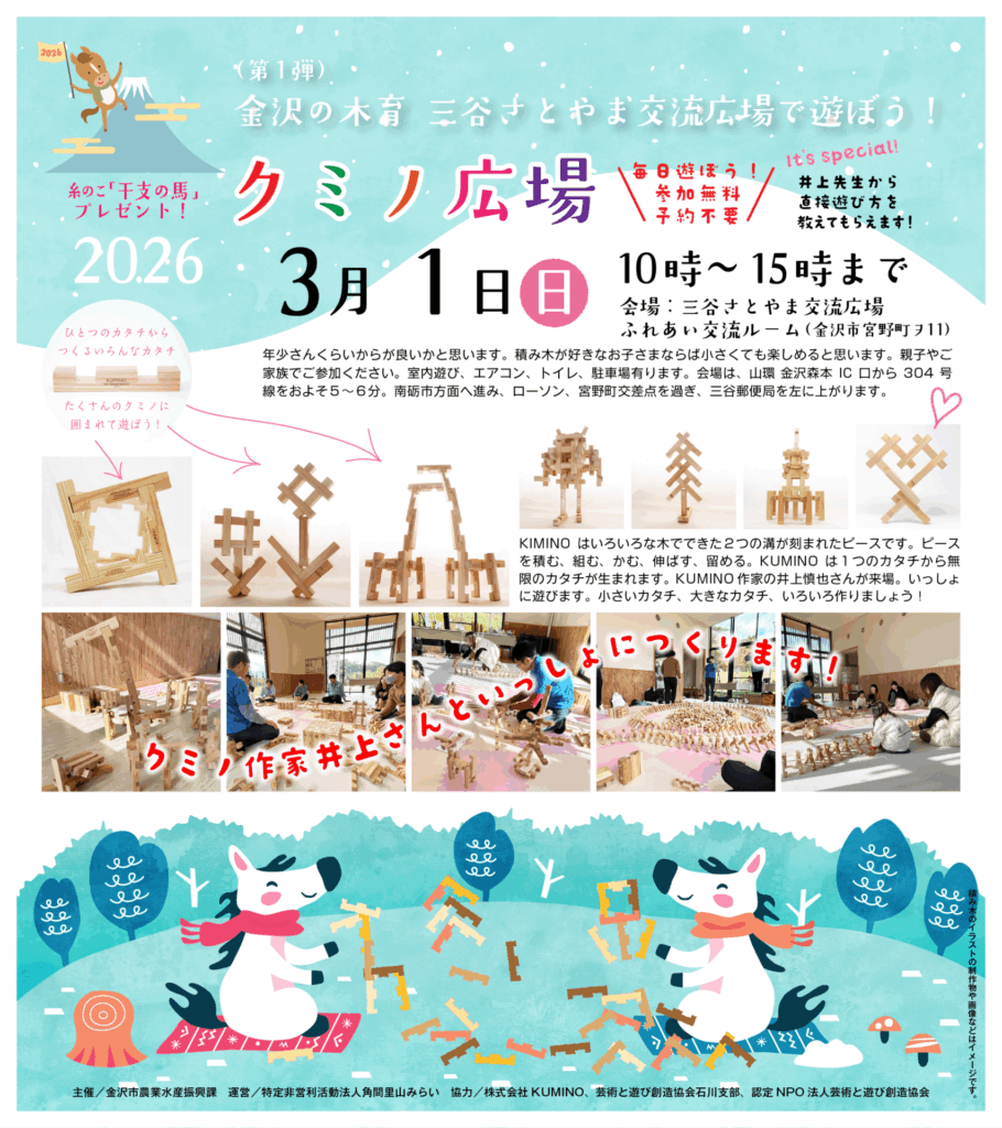 2/28(土)と3/1(日)の2日間、金沢市三谷さとやま交流広場にて『金沢の木育「三谷さとやま広場であそぼう!」おもちゃの広場とクミノ広場』が開催されます!