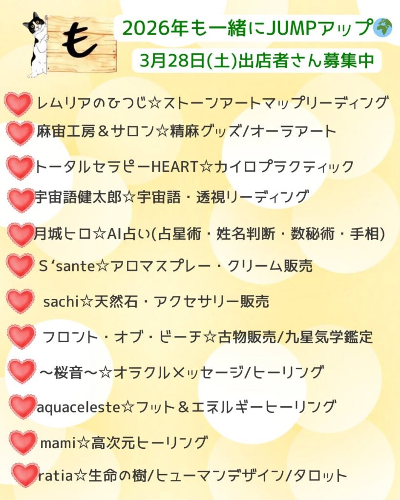 | 内容・特記事項 | 【出店者】 ‐レムリアのひつじ/ストーンアートマップリーディング ‐麻宙工房&サロン/精麻グッズ、オーラアート ‐トータルセラピーHEART/カイロプラクティック ‐宇宙語健太郎/宇宙語・透視リーディング ‐月城ヒロ/AI占い(占星術・姓名判断・数秘術・手相) ‐S’sante/アロマスプレー·クリーム販売 ‐sachi/天然石・アクセサリー販売 ‐フロント・オブ・ビーチ/古物販売、九星気学鑑定 ‐~桜音~/オラクルメッセージ、ヒーリング ‐aquaceleste/フット&エネルギーヒーリング ‐mami/高次元ヒーリング ‐ratia/生命の樹、ヒューマンデザイン、タロット ※詳細は公式SNSをご確認ください ※一部予約が必要なものもございます |