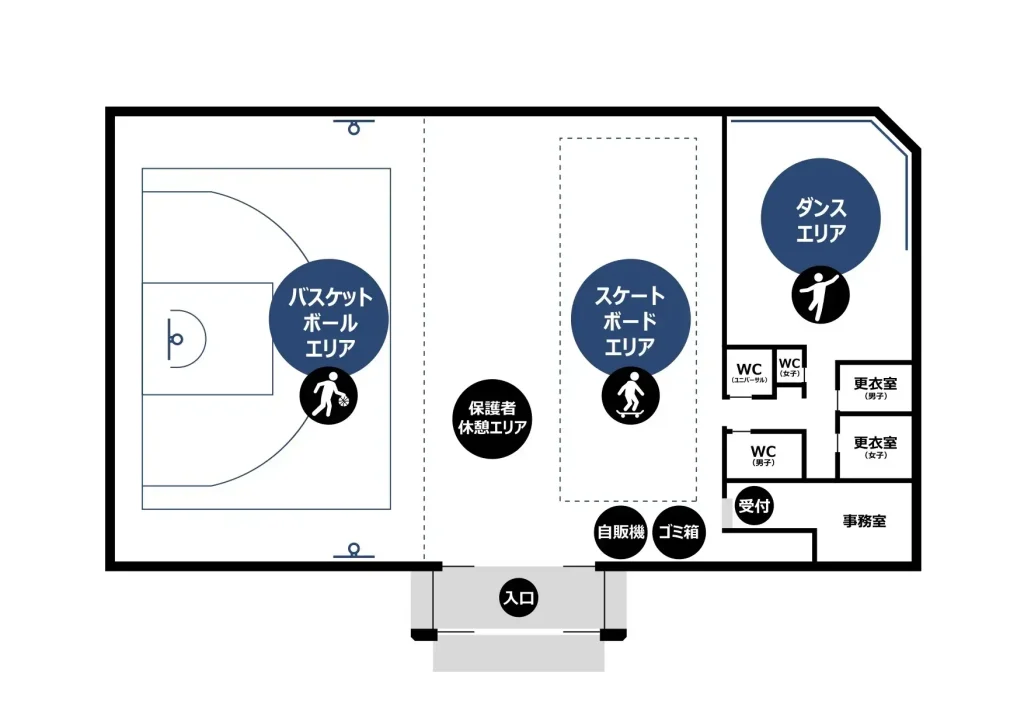 こちらの施設には、3×3(スリー・エックス・スリー)バスケットボール、スケートボード、ダンスが楽しめるエリアが備えられています。子どもたちがのびのびと遊べる場として利用できるよう、高校生までの利用料金は無料です。また、プロを招いたスクールの開催や、イベント会場としての利用も予定されています。