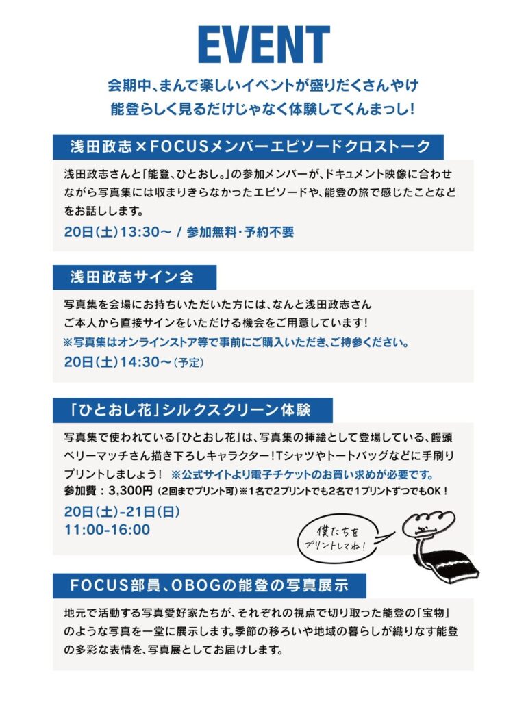 会期内特別イベントスケジュールも予定されております。撮影時のエピソードを聞けるクロストークや、エピソード写真集「能登、ひとおし。」を事前購入して会場にお持ちいただいた方には、浅田政志さんご本人からサインをいただける機会も!詳細は公式サイトをご確認ください。