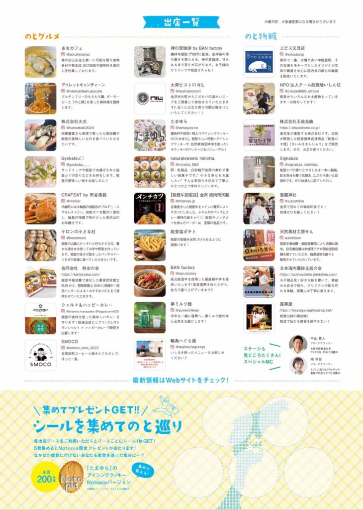 | 内容・特記事項 | 入場無料 ■ステージ ■のとグルメ ■のと物販 <スペシャルゲスト> ものまねタレント ハリウリサ&河口こうへい |
