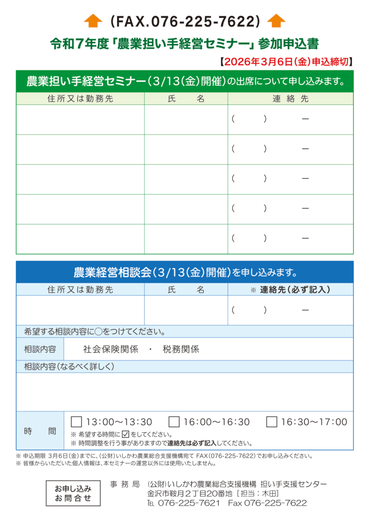 3月13日(金)に、金沢市の石川県地場産業振興センターにて「令和7年度 農業担い手 経営セミナー」が開催されます。