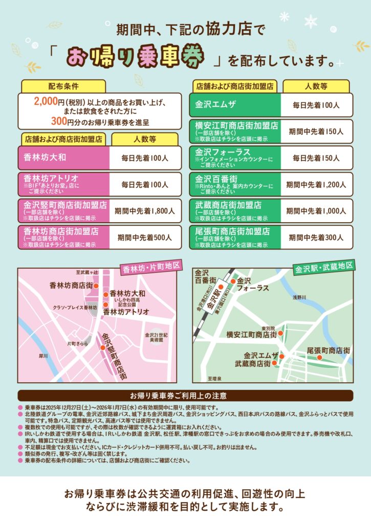 利用内容まちなかの協力店舗や商店街加盟店において、2,000円(税別)以上の買い物や飲食をされた方を対象に、帰りのバスや電車で利用できる「お帰り乗車券」をプレゼントします(先着順)。