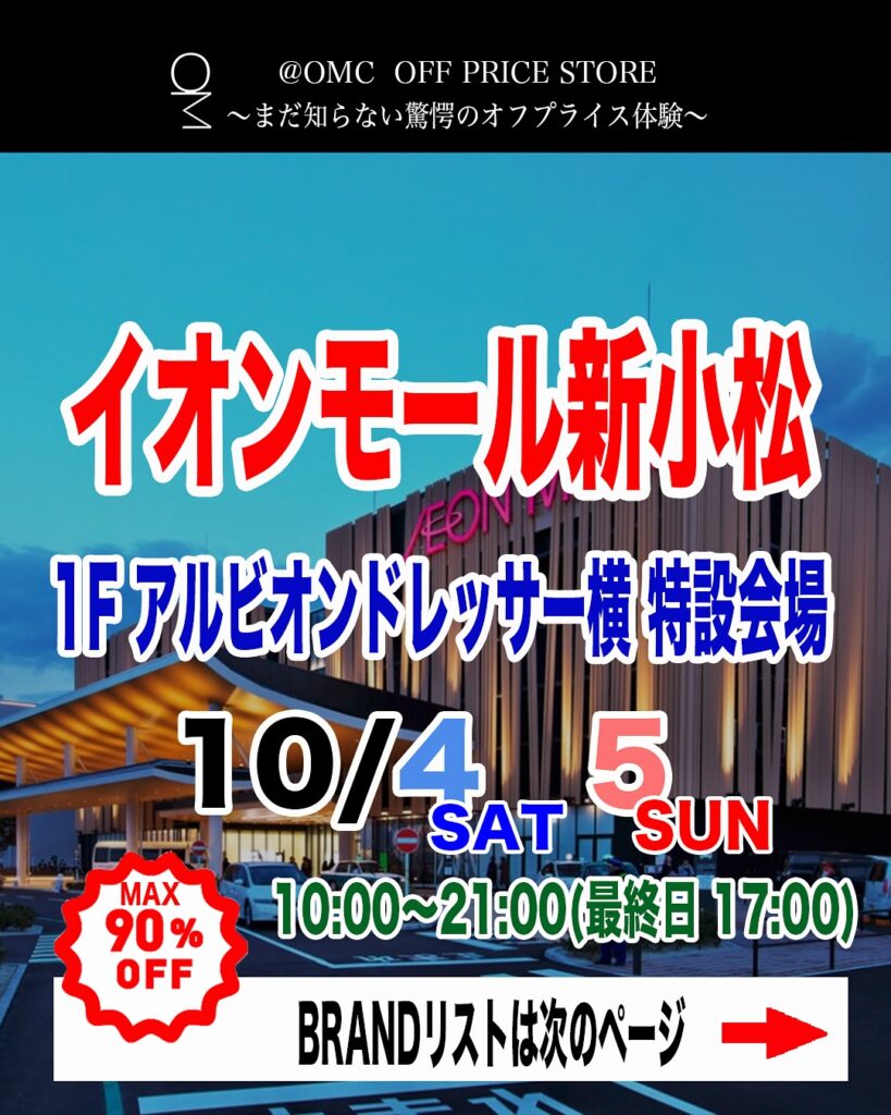 2025年10月4日(土)、10月5日(日)の2日間、イオンモール新小松特設会場にて「@OMC OFF PRICE STORE」が開催されます。