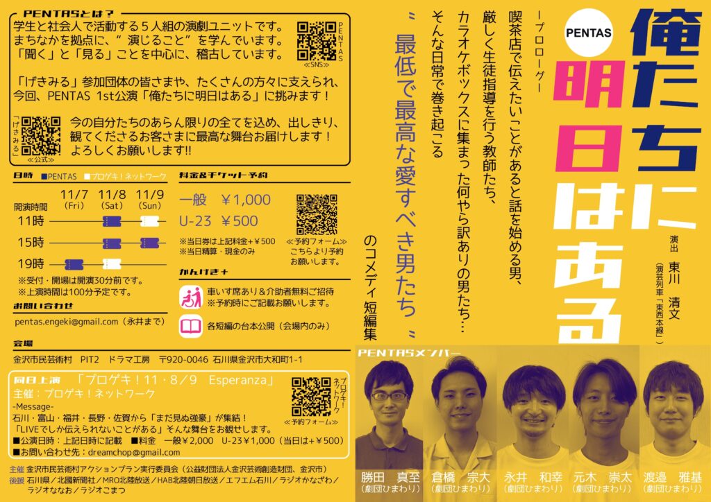 2025年11月7日(金)~11月9日(日)の3日間、金沢市民芸術村にてPENTAS公演「俺たちに明日はある」が開催されます。