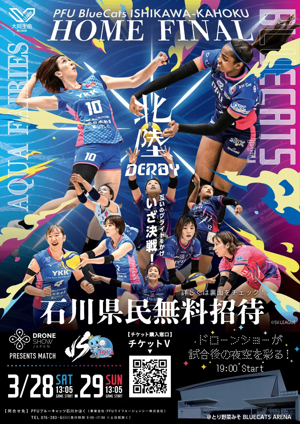 3/28(土),3/29(日)、女子プロバレーボールチーム PFUブルーキャッツ石川かほくによる、プロバレーボールとして国内初となる屋外ドローンショー「BlueCats Night Canvas supported by Drone Show Japan」が開催されます!