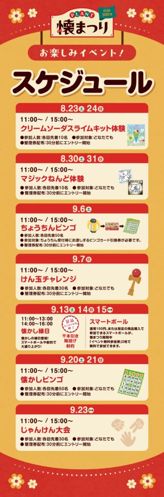 レトロで懐かしいフードや駄菓子、雑貨や家電など見ているだけでも楽しめるイベントです♪お買い物以外にも、提灯づくりやビンゴゲーム、縁日などお子様から大人まで楽しめる企画が盛りだくさん♪なんと、無料で参加できるゲームもあります♪