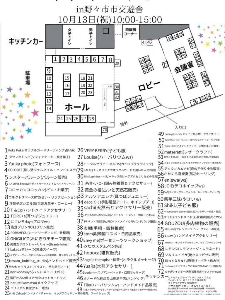 内容・特記事項 | ハンドメイド品販売 ワークショップ リラクゼーション おやつやお弁当販売 占い ミニ縁日 キッチンカーなど 当日は本部にて「Trick or Treat」でプレゼントあり! 大人も子供もぜひ声をかけてみてください |