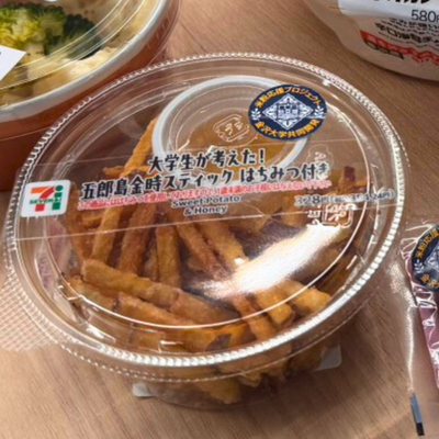 五郎島金時を米粉でスティック状に揚げました。能登産の100%天然の蜂蜜付きです。