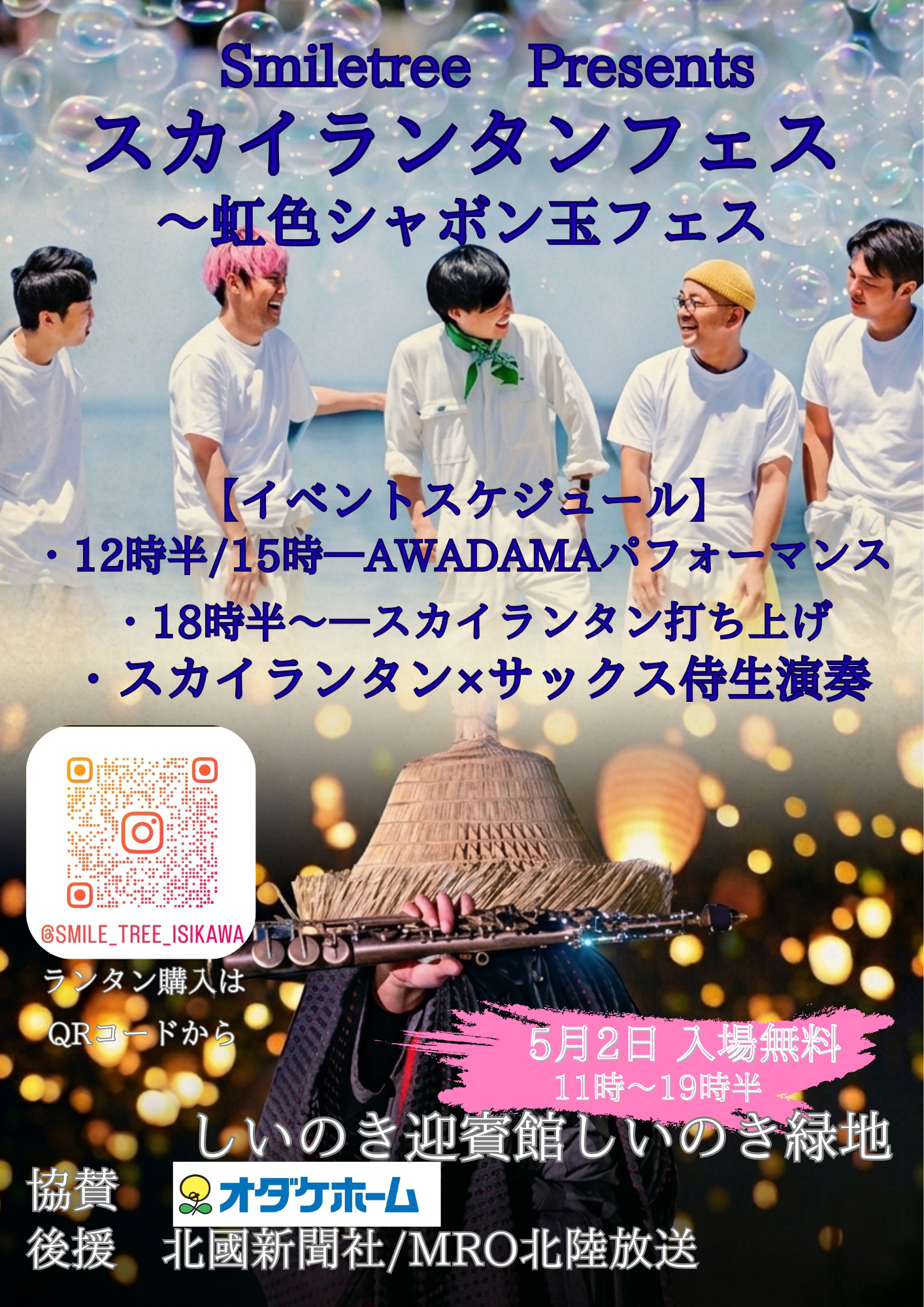 | 内容・特記事項 | ★昼は大人気パフォーマーAWADAMA参加決定! 小さなお子様から大人まで皆んな笑顔になるパフォーマンスを ★日没からはサックス侍参加決定! 空一面に広がるスカイランタンとサックスの音色が重なる特別な日 ★総勢20台出店キッチンカー!食べたいグルメがきっとある 昼も夜も笑顔と感動を届けます!大切な人と最高のGWを ※入場料無料。ランタンの打ち上げ参加にはチケットが必要です。 ランタンは1基3人まで可能。 ランタン希望の方はSmiletree石川のプロフィール、チケットリンクより |