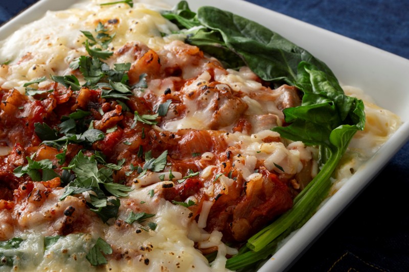 ゴロゴロお肉の食感!トマトベースのミートソースとホワイトソースの濃厚な味わい