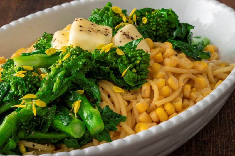 菜の花のほろ苦さの素朴な味わい。お子様から大人の方まで親しみやすいバター醤油のソースでどうぞ!