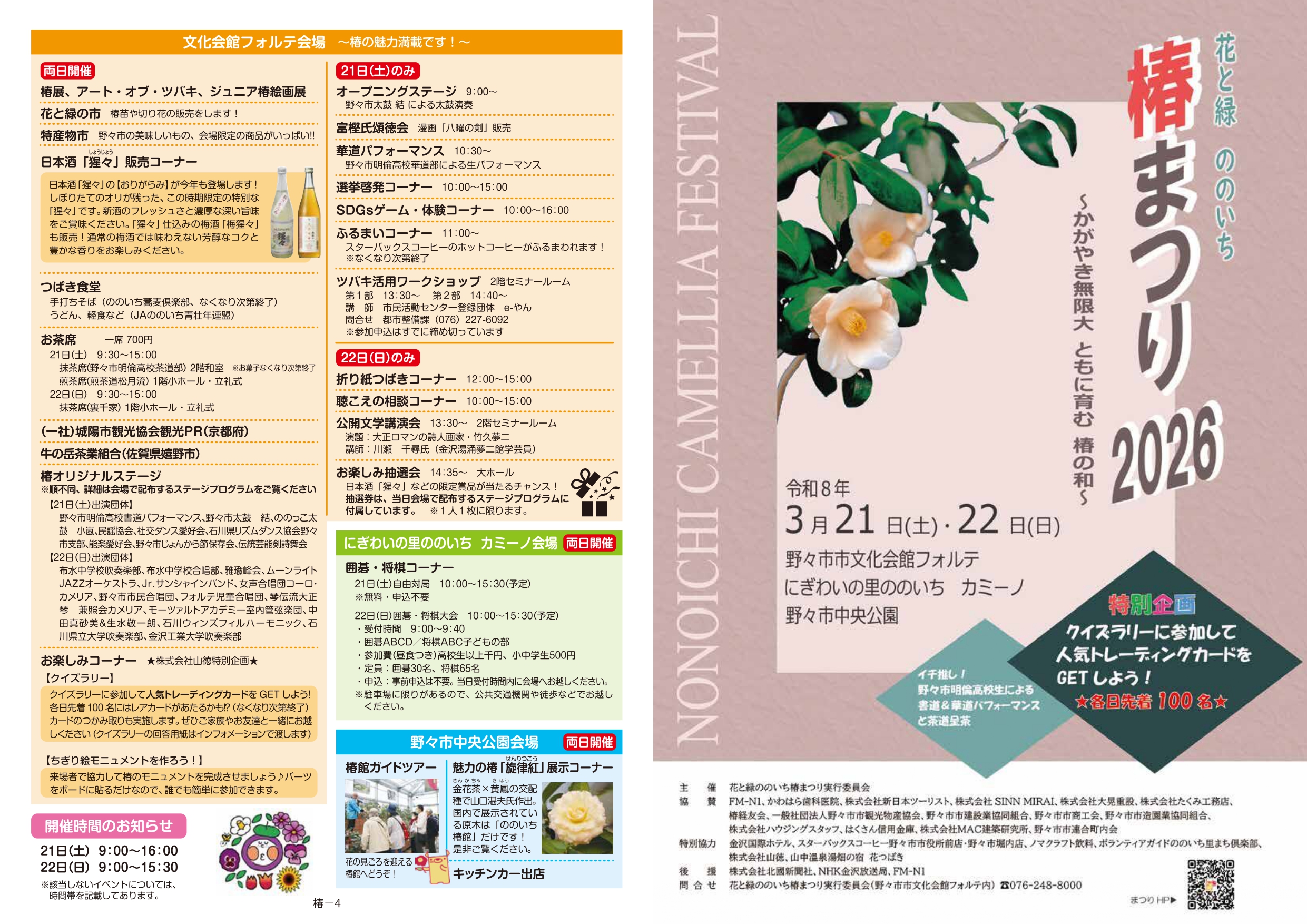 3月21日(土)、3月22日(日)の2日間、野々市市文化会館フォルテ・にぎわいの里ののいち カミーノ・野々市中央公園を会場として「花と緑ののいち椿まつり2026」が開催されます。