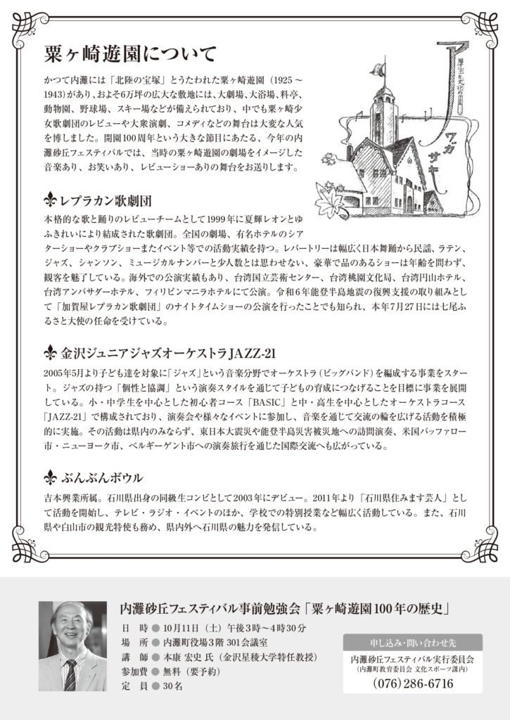 11月24日(月・祝)、粟ヶ崎遊園開園100周年記念及び能登半島地震復興祈念公演として『第28回 内灘砂丘フェスティバル~ 今、よみがえる煌びやかな粟ヶ崎遊園 ~』が開催されます。