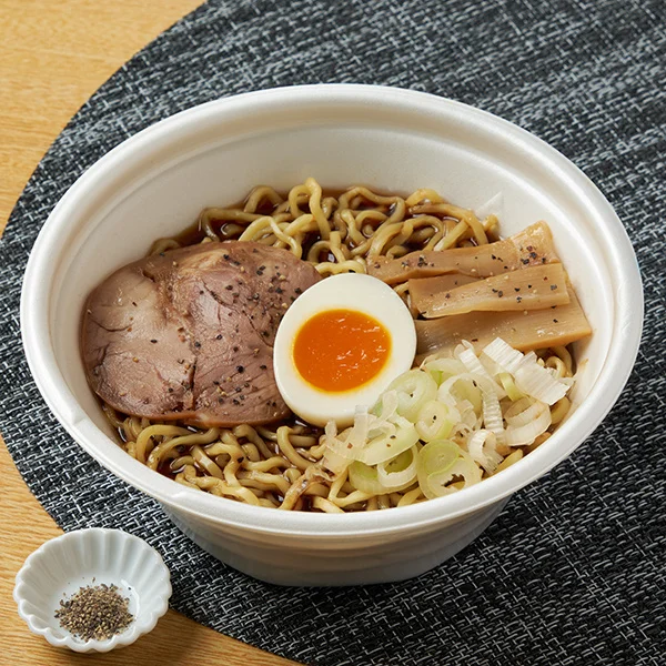 | 【内容】 | ちぢれ麺にあう、深みのある魚介風味の醤油スープを合わせました。「富山ブラック」の特長でもある黒胡椒が効いた味わいです。 |