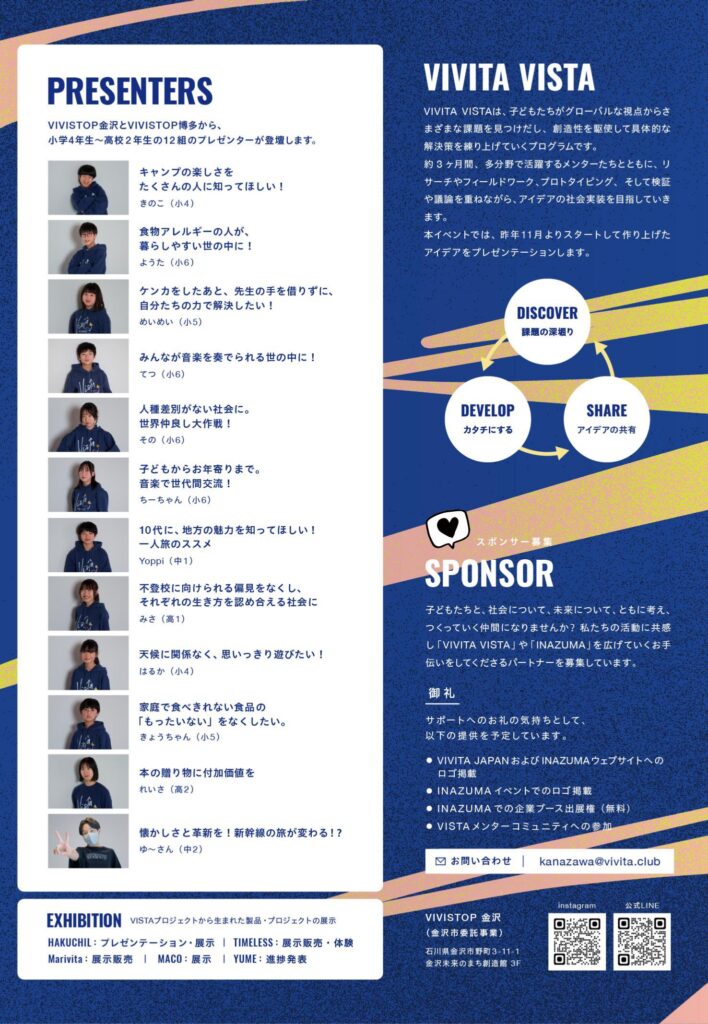 「INAZUMA」は2024年よりスタートした、金沢発のアントレプレナーイベント。今回は子どもたちが社会課題に3ヶ月間本気で取り組むプログラムのアイデアピッチや、プロトタイプの展示が行われるとのことです。