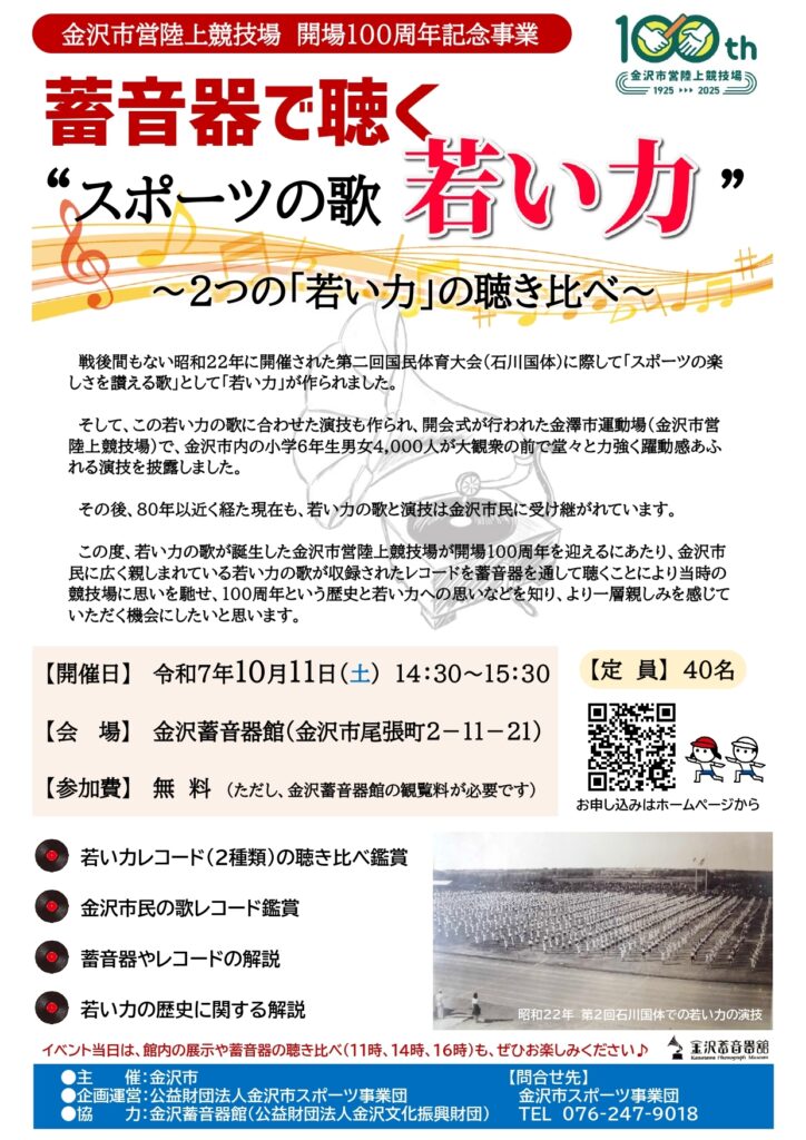 そんな「若い力」が誕生した金沢市営陸上競技場が開場100周年を迎えることとなり、記念事業として金沢市民に広く親しまれている「若い力」を蓄音器を通して聴くイベントが開催されます!