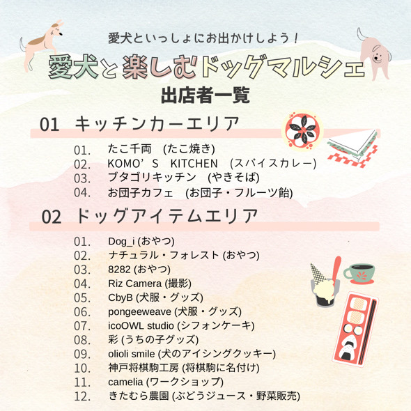 | 内容・特記事項 | ■ 入場無料 ・キッチンカーエリア ・ドッグアイテムエリア ※出店者一覧はこちら |