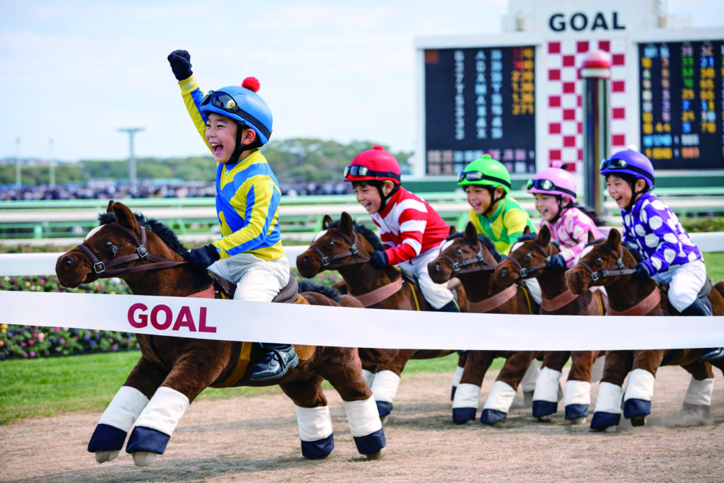 木馬にのって、芝生の上を走りまわろう!本当のレースで使われているジョッキー服やヘルメット、ゴーグルも試着可能!