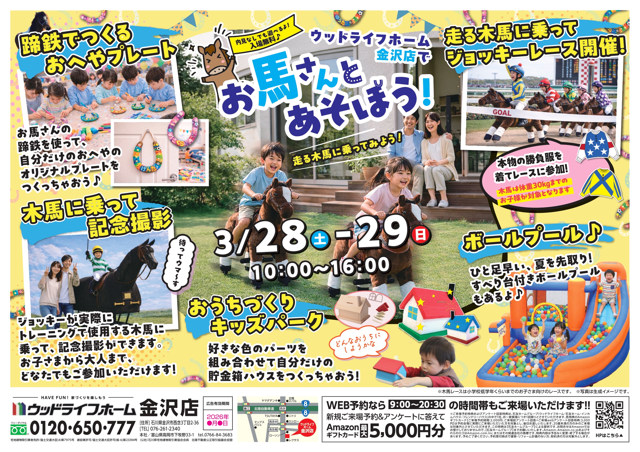 3/28(土),3/29(日)の2日間、ウッドライフホーム金沢店にて「ウッドライフホームでお馬さんとあそぼう!」が開催されます!