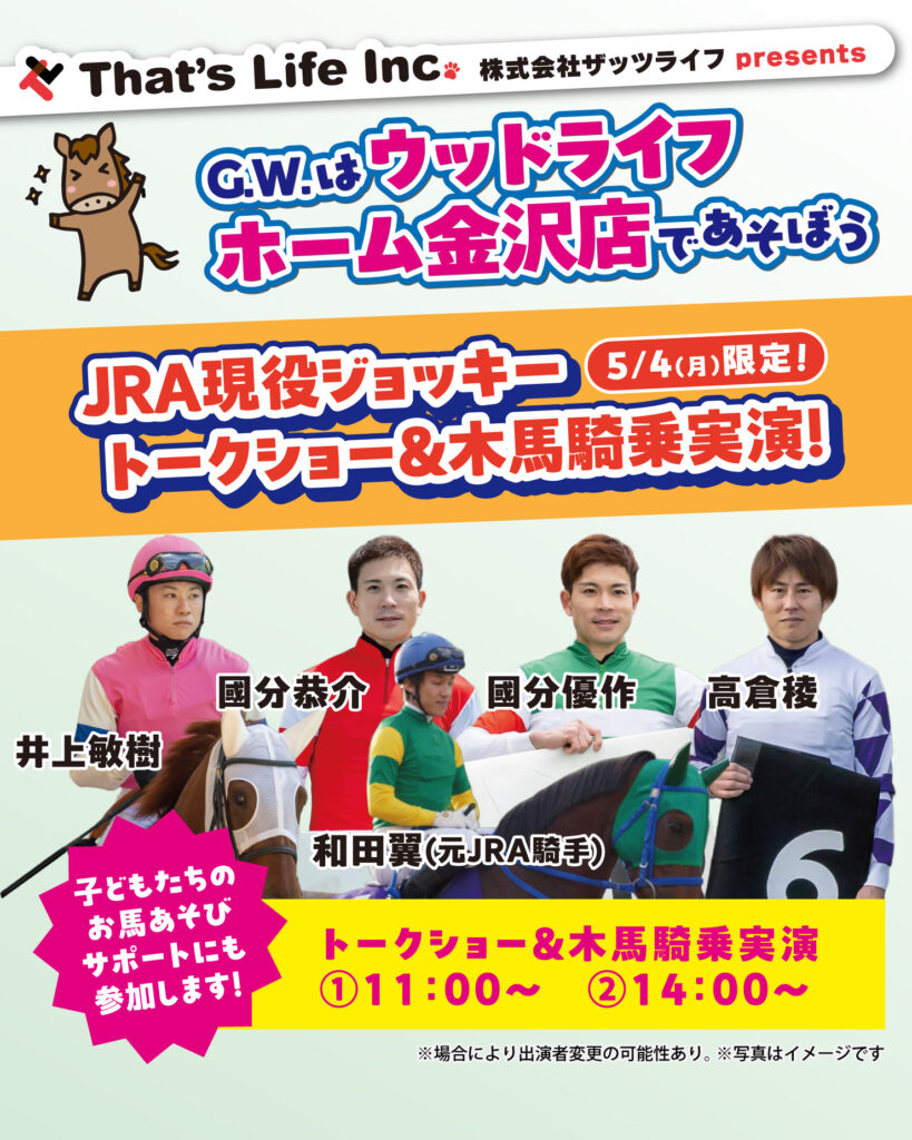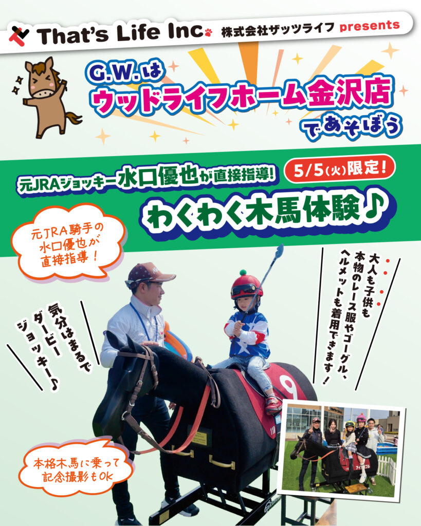 5/4(月),5/5(火)の2日間、ウッドライフホーム金沢店にて「G.W.はウッドライフホーム金沢店であそぼう おウマっし!フェスティバル」が開催されます!