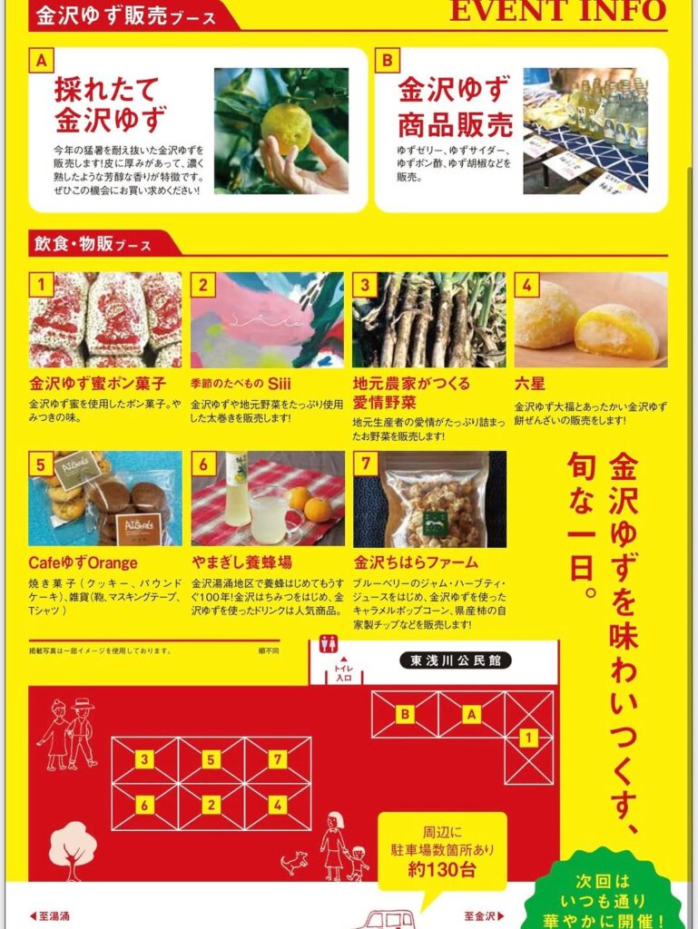 | 内容・特記事項 | ■ メインイベント ・金沢ゆず商品の販売 ・採れたて金沢ゆずの販売 ■ 飲食・物販ブース ・Siii ・地元農家 ・六星 ・CafeゆずOrange ・やまぎし養蜂場 ・金沢ちはらファーム ・金沢ゆず蜜ポン菓子 |