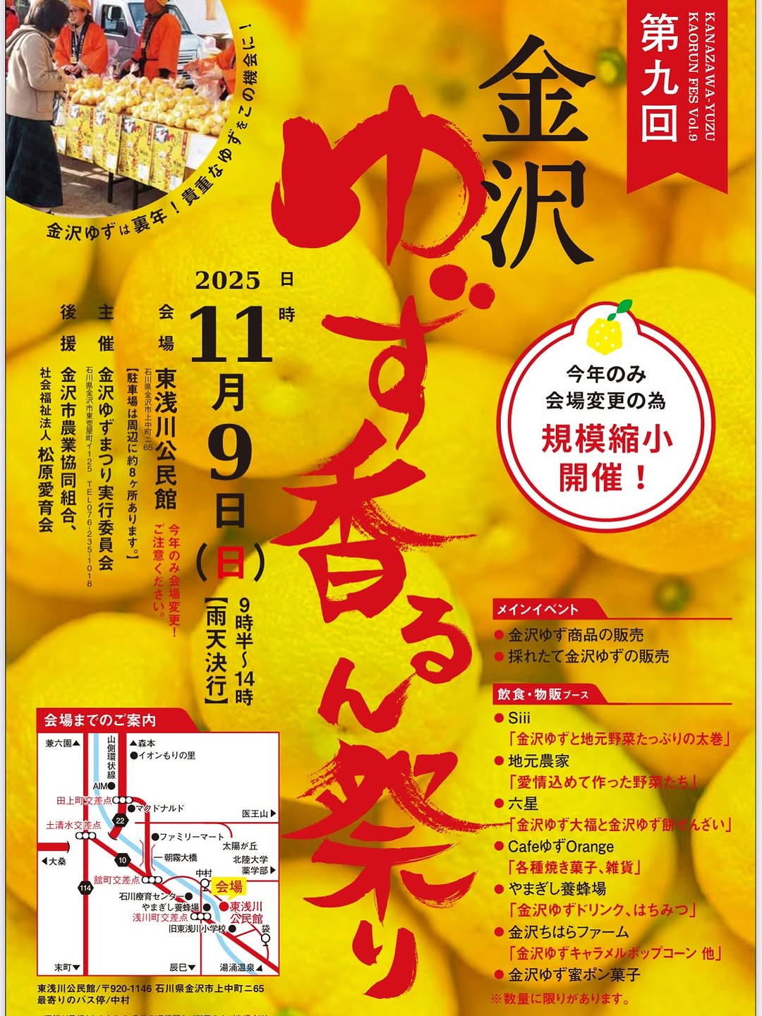 今年のみ会場変更のため規模を縮小して開催とのことです。裏年で貴重な柚子と、金沢ゆずを使ったおいしいものが色々用意されるそうなので、この機会に旬の柚子を楽しみに足を運ばれてみてはいかがでしょうか♪柚子の香りに癒されそうですね♪